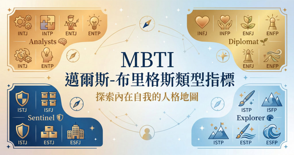 MBTI將人格分為16種類型,每一類型由四個心理偏好組成,並歸納為四大類。
