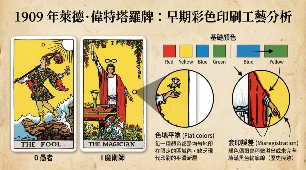 印刷工藝特徵:從 1909 年版本萊德·偉特塔羅牌圖像中可以觀察到,當時的印刷技術主要是色塊平塗。每一種顏色都是均勻地印在限定的區域內,缺乏現代印刷的平滑漸層。此外,如果您仔細觀察某些邊緣,會發現顏色偶爾會稍微溢出或未完全填滿黑色輪廓線的套印誤差,這也是當時分色套印技術留下的歷史痕跡。
